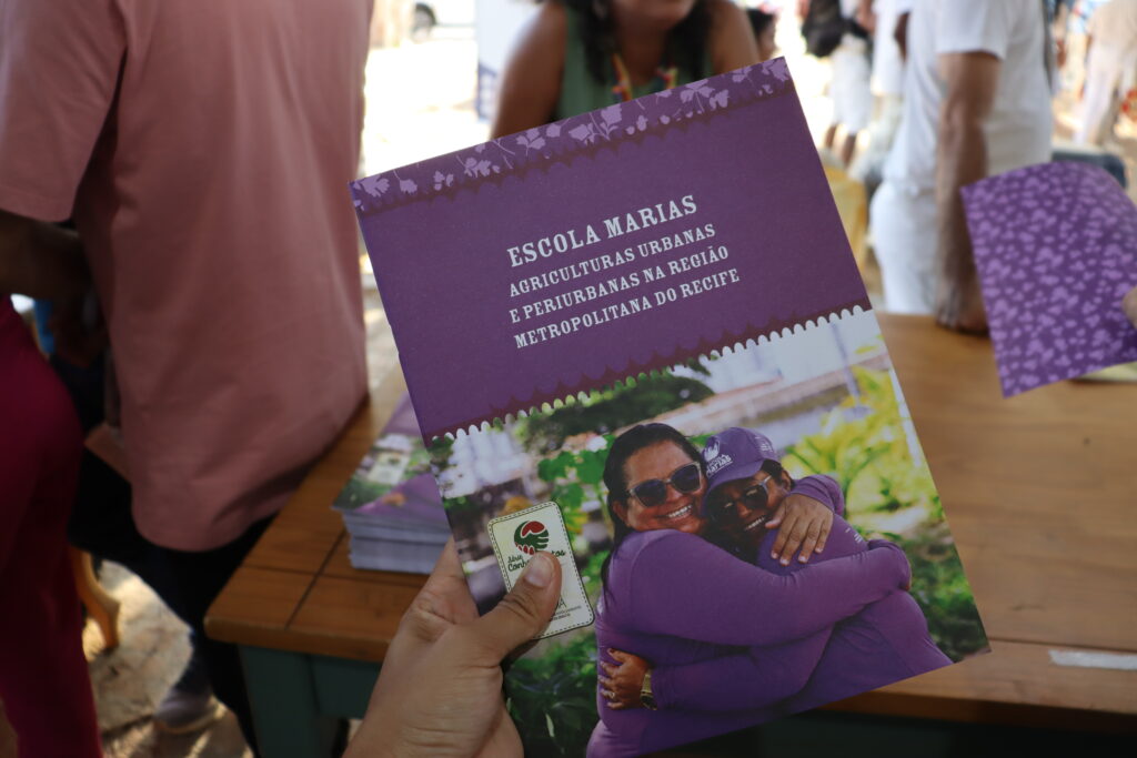 Outra cartilha lançada, “Escola Marias – agricultoras urbanas e periurbanas na região metropolitana de Recife”, do Centro de Desenvolvimento Agroecológico Sabiá (PE), surge de um processo formativo com mulheres da agricultura urbana. Ela reúne experiências de quem cultiva hortas em territórios urbanos e periféricos, abordando técnicas de manejo e questões de feminismo, como divisão sexual do trabalho e violência.