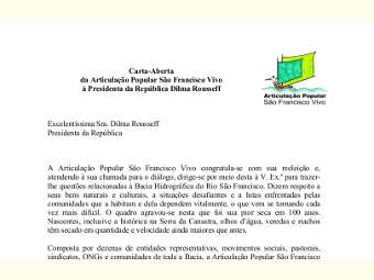 Articulação Popular São Francisco Vivo envia carta à presidenta Dilma Rousseff